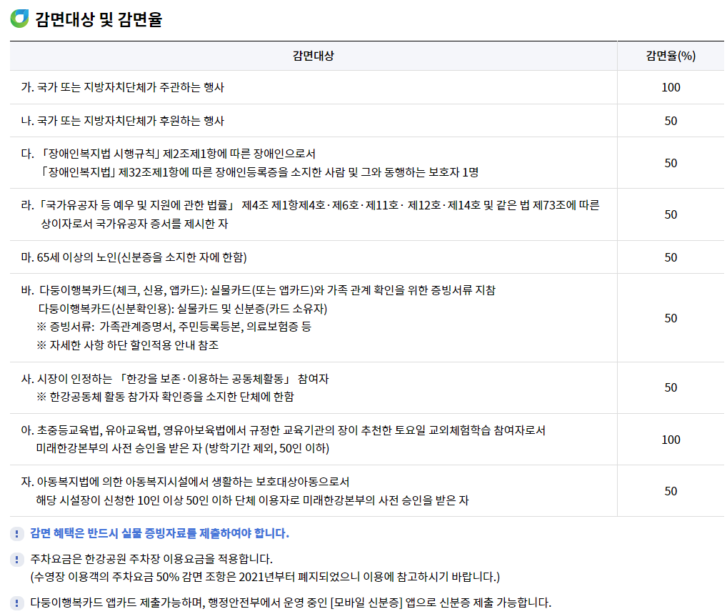 국가 유공자나 65세 이상의 노인(신분증 소지) 한강공동체 활동 참가자, 보호대상 아동 등의 경우에도 관련 증빙자료를 지참하면 최대 50~100% 할인받을 수 있습니다.